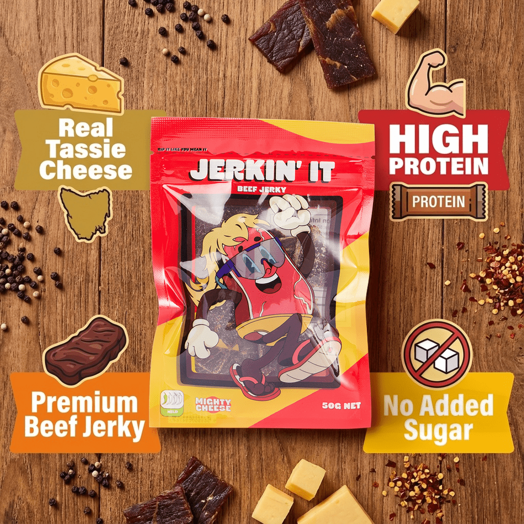 Mighty Cheese blends real sharp Tasmanian cheese with rich, umami beef jerky for a hit that’s bold, nostalgic, and way too easy to smash.
